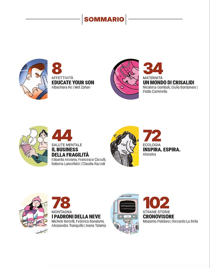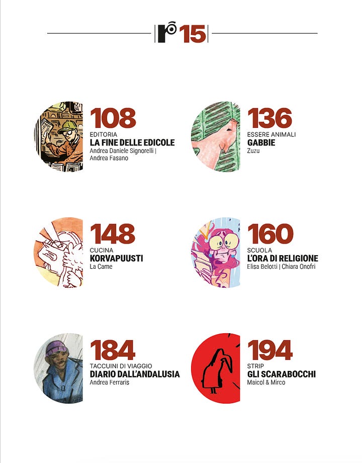 Intorno a queste sei storie, come al solito troverete le rubriche: da quella animalista di Zuzu, in collaborazioni con Essere Animali, a quella ecologista di Alterales, ai taccuini di viaggio di Andrea Ferraris, ai viaggi nei misteri della mente umana di e Riccardo La Bella, fino alla ormai classica rubrica di cucina — questa volta affidata alla Came — e allo scarabocchio di Maicol&Mirco del trimestre.