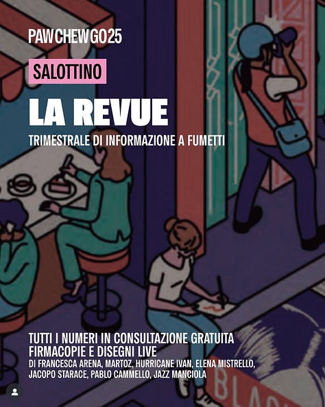 La terza sarà un altro festival, questa volta di illustrazione, il Paw Chew Go, che si svolgerà da BASE, in via Bergognone, sabato e domenica. Avremo un salottino dedicato dove troverete dalle 10 alle 21 Andrea Coccia e un po’ di autrici e autori della Revue a fare disegni e chiacchiere con voi: Hurricane Ivan, Elena Mistrello, Francesca Arena, Pablo Cammello, Jazz Manciola e Jacopo Starace!