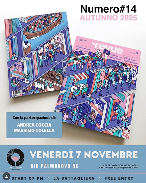 La prima occasione del lungo weekend milanese sarà in un bar, La Battagliera di via Palmanova, dove la sera di venerdì 7 novembre, Massimo Colella e Andrea Coccia racconteranno come è nata la Revue e qual è l’idea che muove questa impresa eccezionale, ovvero fare informazione a fumetti empatica mentre il mondo del giornalismo va a una velocità folle, ha una violenza tremenda e ci bombarda di contenuti ogni secondo.