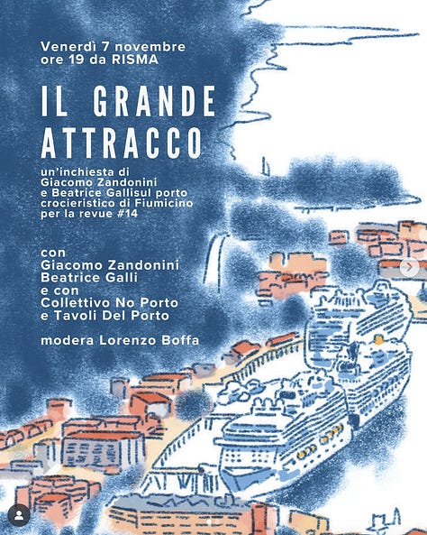 Venerdì 7 novembre, a partire dalle 19 saremo ospiti delle amiche di Risma Bookshop dove Giacomo Zandonini e Beatrice Galli racconteranno la loro bellissima inchiesta Il grande attracco (che abbiamo pubblicato nel numero 14) insieme ai membri del Collettivo No Porto!