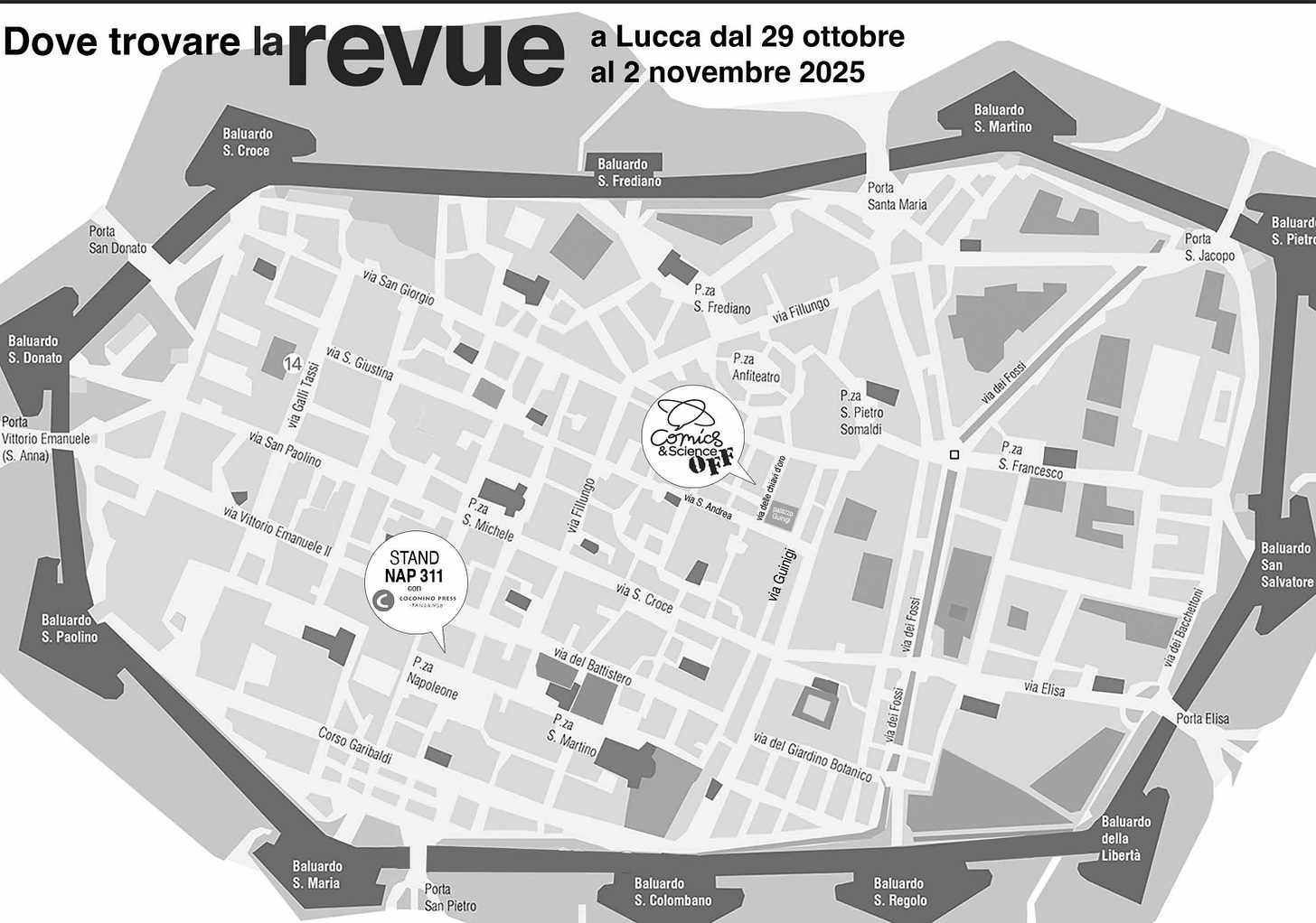 Quest’anno ci trovi in due posti diversi. Allo stand 311 di Coconino, dentro il padiglione Napoleone e allo spazio Comics & Science OFF, in Via delle Chiavi d’Oro 6, vicino alla Torre Guinigi.